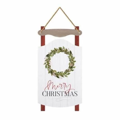 Includes sentiment, Merry Christmas String Sign Greet guests with a welcoming sentiment upon entry to your home with this door ornament. Includes a jute string for hanging. Made with MDF Wood. This sign is in the shape of a sled.